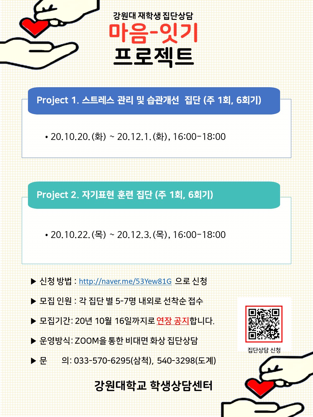 강원대 재학생 집단상담(마음-잇기 프로젝트) 안내<삼척-도계캠퍼스>-10/16(금) 연장