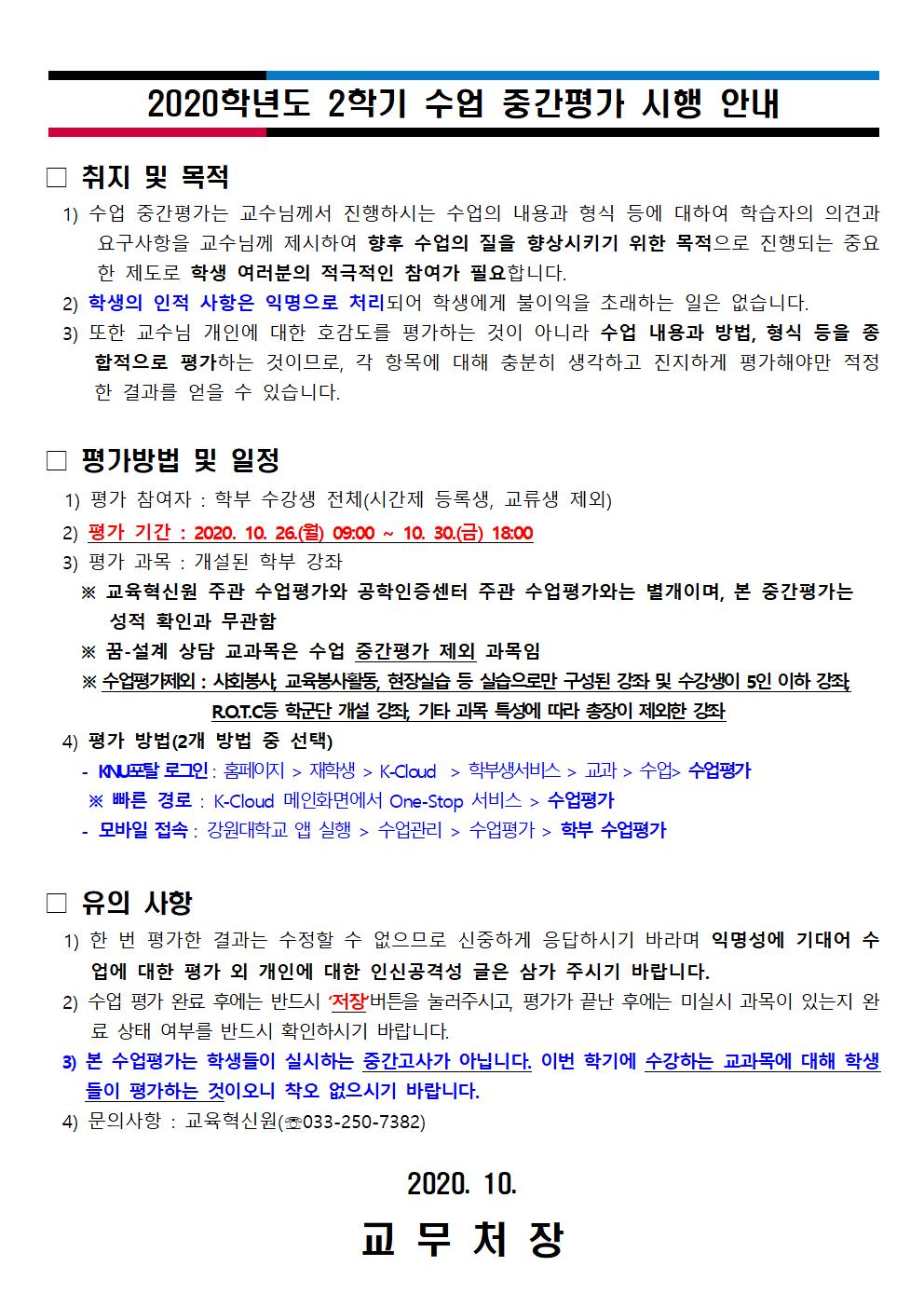 ※ 본 수업평가는 학생들이 실시하는 중간고사가 아닙니다.이번 학기에 수강하는 교과목에 대해 학생들이 평가하는 것이오니 착오 없으시기 바랍니다.