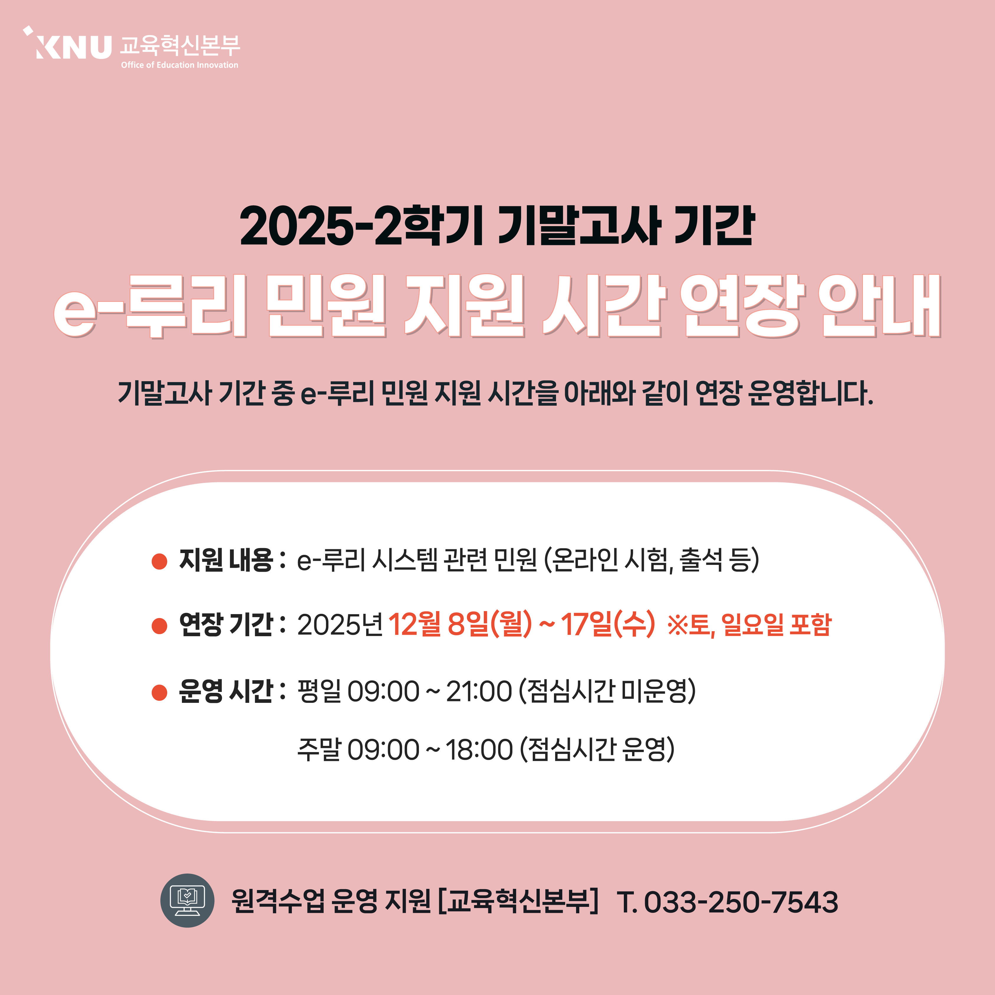 2025-2학기 기말고사 기간 중 e-루리 민원 지원 시간 연장 안내
